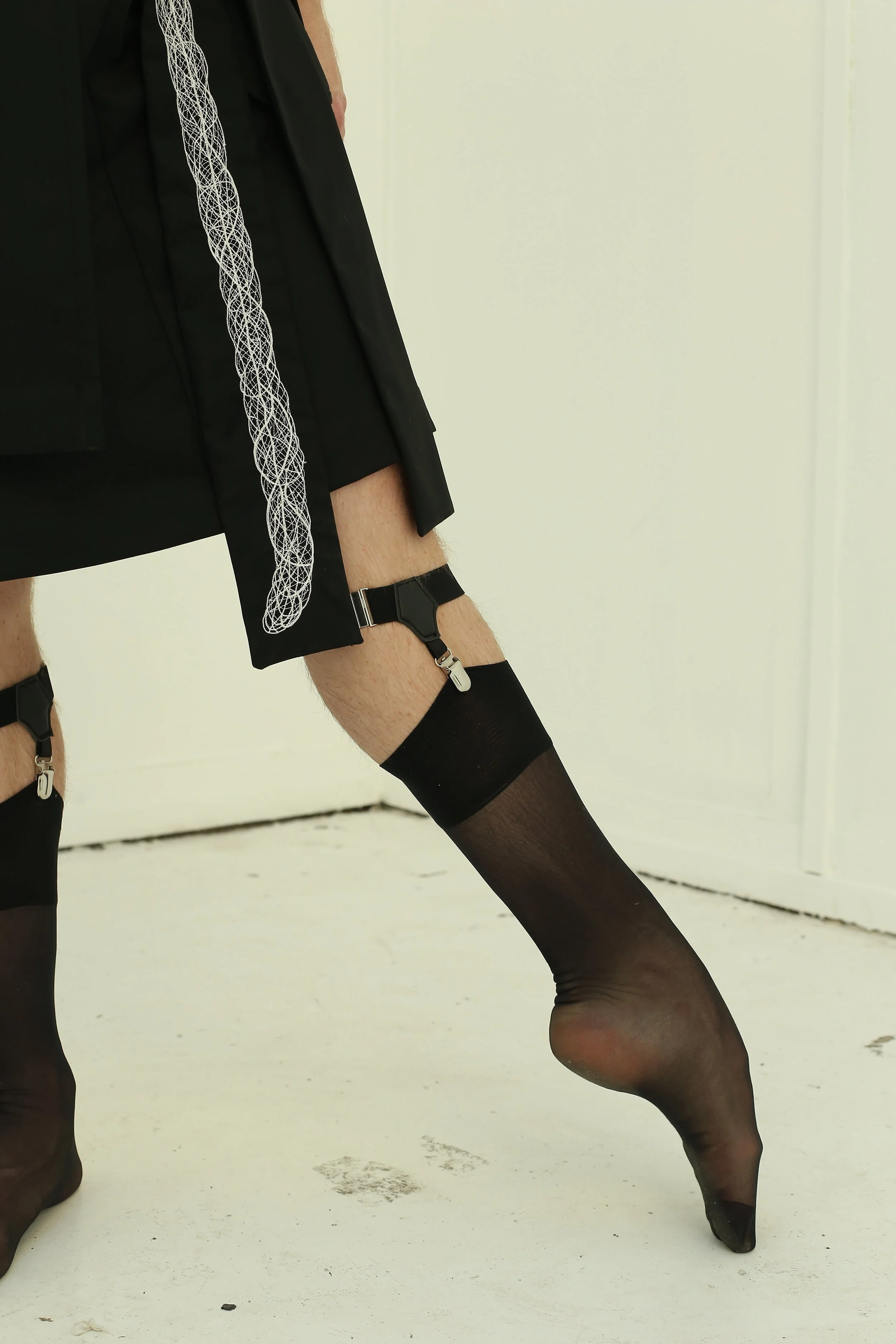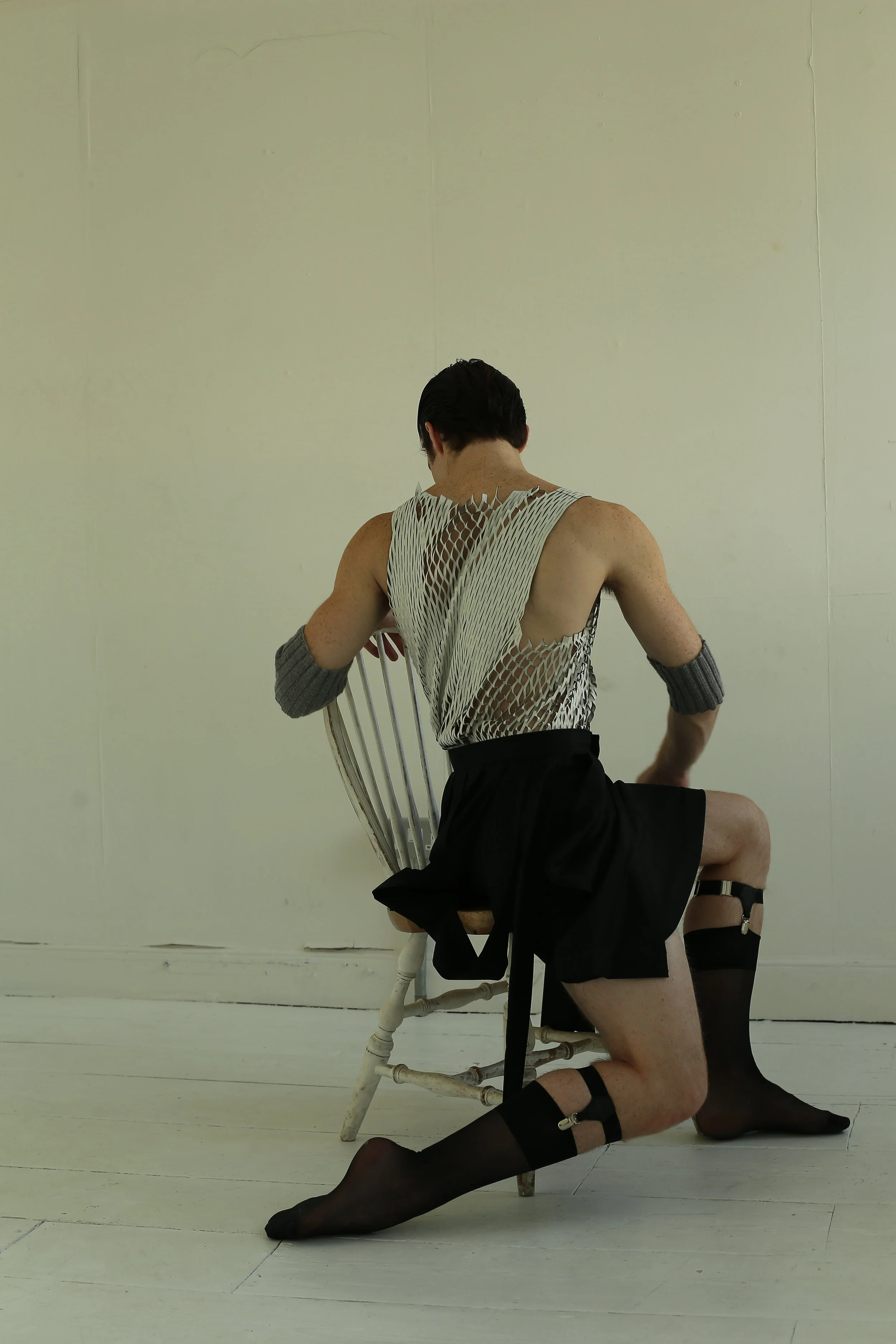 The start of an ongoing collaborative project with First Artist David Donnelly of the Royal Ballet, ‘field dance’ takes the form of movement studies informed by Robert Wilson’s masterwork ‘Einstein on the Beach.’ Nappa leather is lasercut in a technique akin to skin grafting, wool crepe is hand embroidered with an abstracted tongue designed by Nancy Riegelman, and merino wool armbands are knitted to resemble muscle fibres.